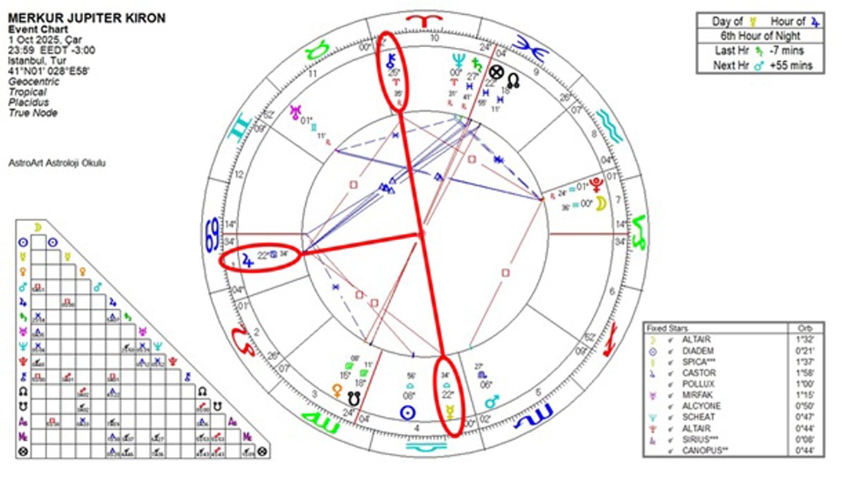 Terazi burcunda seyreden Merkür ve Yengeç burcunda seyreden Jüpiter arasındaki dik açının kesinleşeceği ve Kiron ile T-kare oluşturacağı bir haftaya giriyoruz. Dolayısıyla adaletle, hukukla ilgili konularda stresler, uzlaşmazlıklar olasıdır. Bu açı kalıbı aynı zamanda finansal konularla, eğitimle, yayıncılıkla, yabancılarla, dinle ve inançlarla ilgili konularda da streslere ve yaralayıcı sert durumlara işaret ediyor olabilir. Aşağıda 1 Ekim-3 Ekim tarihleri arasında çok etkin olacak bu açı kalıbının haritasını görmektesiniz.