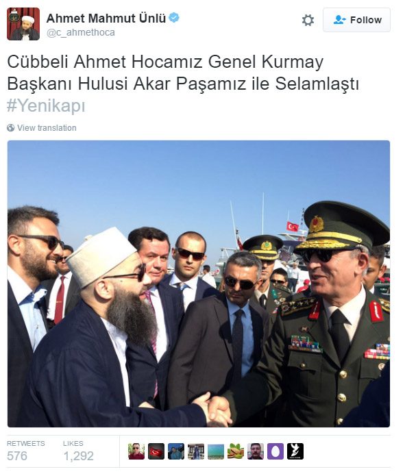 Akar'ı konuşmasının ardından tebrik edenler arasında Cübbeli Ahmet lakabıyla bilinen Ahmet Mahmut Ünlü de vardı. Ünlü bu görseli twitter hesabından paylaştı."BAYRAĞINI SEVEN EZİCİ ÇOĞUNLUKTAKİ MENSUPLARIYLA KESİNLİKLE HİÇBİR ALAKASI YOKTUR"
