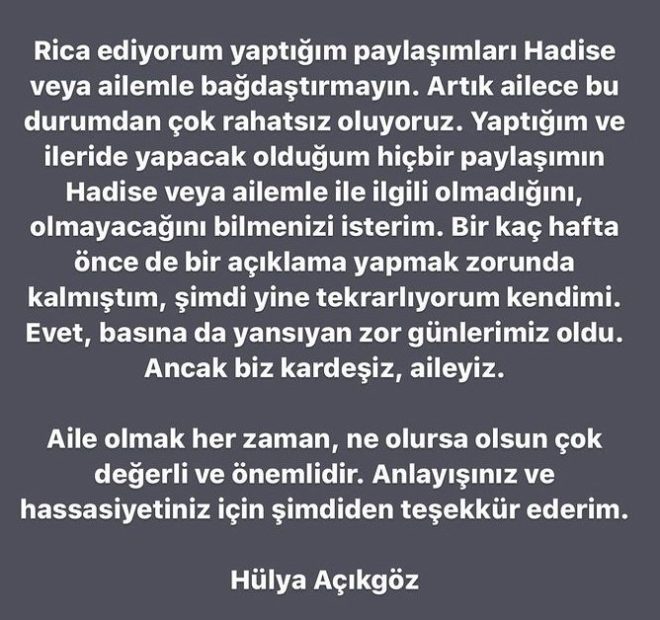 "Rica ediyorum yaptığım paylaşımları Hadise veya ailemle bağdaştırmayın. Artık ailece bu durumdan çok rahatsız oluyoruz. Yaptığım ve ileride yapacak olduğum hiçbir paylaşımın Hadise veya ailemle ilgili olmadığını, olmayacağını bilmenizi isterim. Birkaç hafta önce de bir açıklama yapmak zorunda kalmıştım, şimdi yine tekrarlıyorum kendimi. Evet, basına da yansıyan zor günlerimiz oldu. Ancak biz kardeşiz, aileyiz. Aile olmak her zaman, ne olursa olsun çok değerli ve önemlidir. Anlayışınız ve hassasiyetiniz için şimdiden teşekkür ederim."