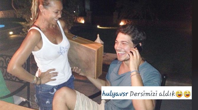 Tatile devam eden ünlüler arasında olan Çağatay Ulusoy ve Hülya Avşar sohbetlerini tavla maçıyla tatlandırmak isteyince ortaya bu görüntü çıktı. Medcezir adlı diziyle başarılı bir sezonu geride bırakan yakışıklı oyuncu tatilde buluştuğu Hülya Avşar’la yaptığı tavla maçını kazanmanın keyfiyle gülümserken tavlayı kolunun altına Avşar kızı da bu yenilgiden pek de üzgün görünmüyordu. Hülya Avşar instagram hesabından paylaştığı bu fotoğrafın altına ‘Dersimizi aldık’ yazmış.