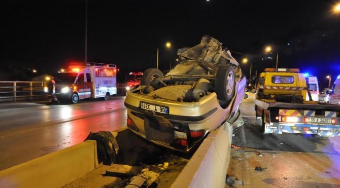 - İZMİR'in Bayraklı İlçesi'nde, sürücüsünün direksiyon hakimiyetini kaybettiği otomobil orta refüje çarparak takla attı. Kazada hurdaya dönen otomobildeki sürücü Görkem Kurt kazayı şans eseri hafif sıyrıklarla atlattı.