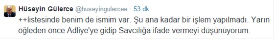 14 Aralık operasyonunda 31 kişilik gözaltı listesinde adı bulunan eski Zaman gazetesi yazarı Hüseyin Gülerce, Savcılığın basın açıklamasından yeni haberi olduğunu ve yarın ifade vermeyi düşündüğünü söyledi.