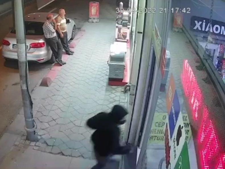 Öte yandan, yaşanan olay iş yerinin güvenlik kamerasına yansıdı. Görüntülerde, kapşonlu ve maskeli kişinin koşarak içeri girdiği, yanındaki silahla bir el ateş ettiği ve daha sonra yine koşarak olay yerinden uzaklaştığı, kaldırımda sohbet eden iki kişinin paniklediği görülüyor.