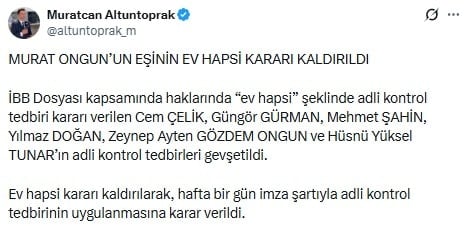 Ev hapsi kararı kaldırılarak, hafta bir gün imza şartıyla adli kontrol tedbirinin uygulanmasına karar verildi.