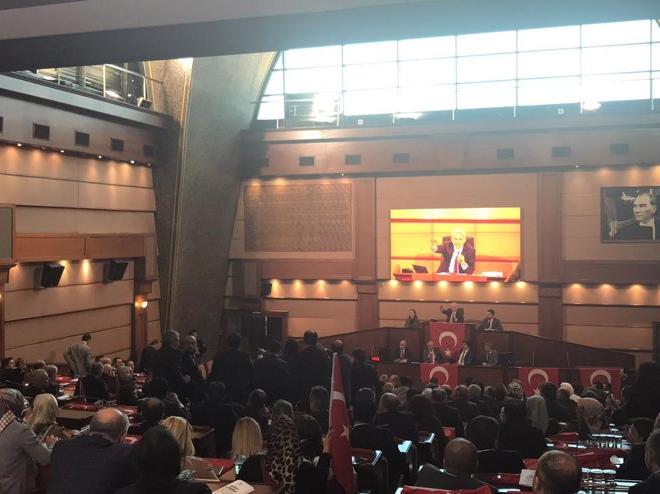 Türk bayrakları ile donatılan meclis salonunda gerçekleştirilen oturumda İdlib şehitleri için saygı duruşunda bulunulduktan sonra İstiklal Marşı okundu.