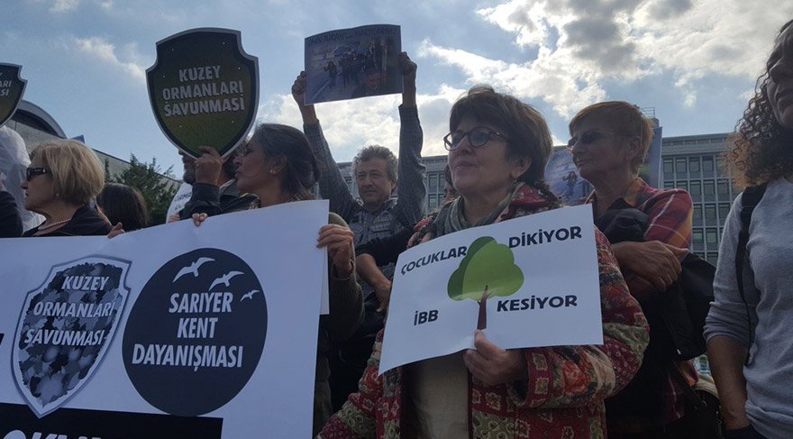 "İBB elini Sarıyer'den çek", "Kesme yaşat Kuzey'i koru" sloganları atan grup adına yapılan açıklamada "İstanbul Büyükşehir Belediyesi'nin Kuzey Ormanları'na karşı giriştiği saldırının yeni bir sayfası olan Sarıyer-Uskumruköy'deki ağaç kesimlerine karşı İBB önündeyiz" denildi.