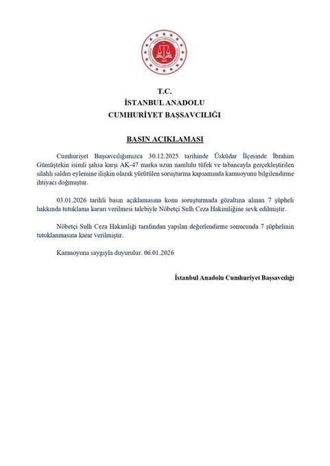 İstanbul Anadolu Cumhuriyet Başsavcılığı tarafından yapılan yazılı açıklamada, 3 Ocak'ta gözaltına alınan yedi şüphelinin tutuklanmaları talebiyle Nöbetçi Sulh Ceza Hakimliği'ne sevk edildiği ifade edildi.