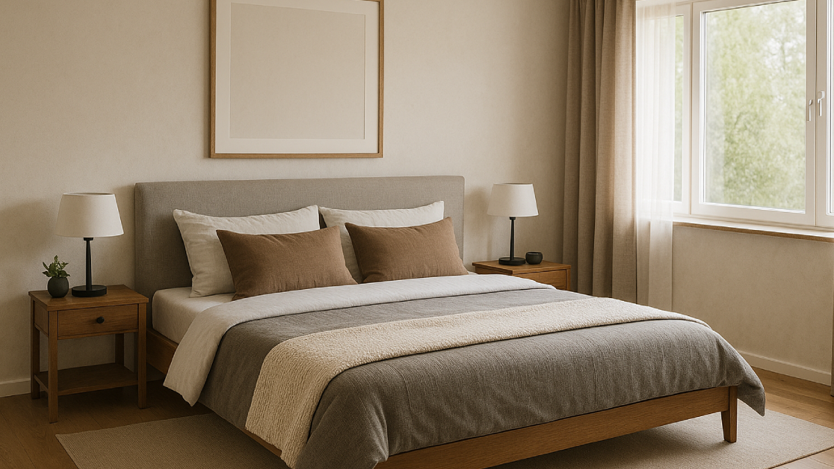 Yatağı uzun ve boş bir duvara yerleştirmek hem huzurlu hem de estetik bir düzen sağlar. Komodinlerin iki yanda olması ve yatağın üzerinde bir sanat eseri bulunması, odaya uyum ve ritim katar.