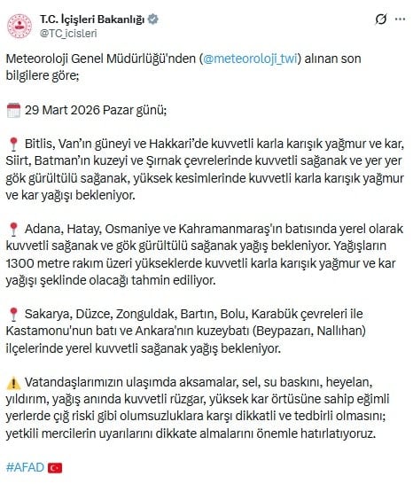 İçişleri Bakanlığı, Meteoroloji Genel Müdürlüğü’nden alınan verilere dayanarak, 29 Mart 2026 Pazar günü 18 ilde olumsuz hava koşullarının etkili olacağını duyurdu.