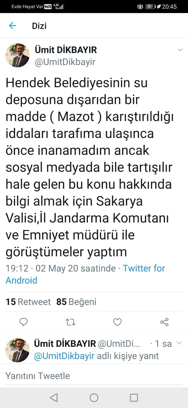Hendek AKP İlçe Başkanı Hasan Serdar Baykal ise suya mazot karıştırılmasıyla ilgili olarak "Adli tahkikat aşamasına zarar vermemek maksadıyla ayrıntısını sizlerle şuan paylaşamıyorum. İlçemizde yaşanan su problemi dışarıdan müdahaleyle gerçekleşmiş bir vaka" dedi.