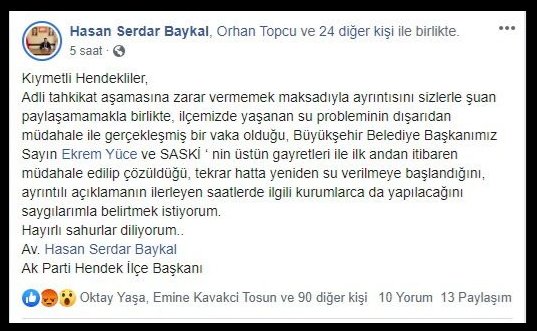 * Hendek halkı adına süreci titizlikle takip edeceğim. Hiç kimsenin siyasi hesaplaşmasının ve itişip kakışmasının bedelini Hendek halkına ödetmesi asla kabul edilemez! Hendek halkı sizin siyasi oyunlarınızın piyonu değildir!
