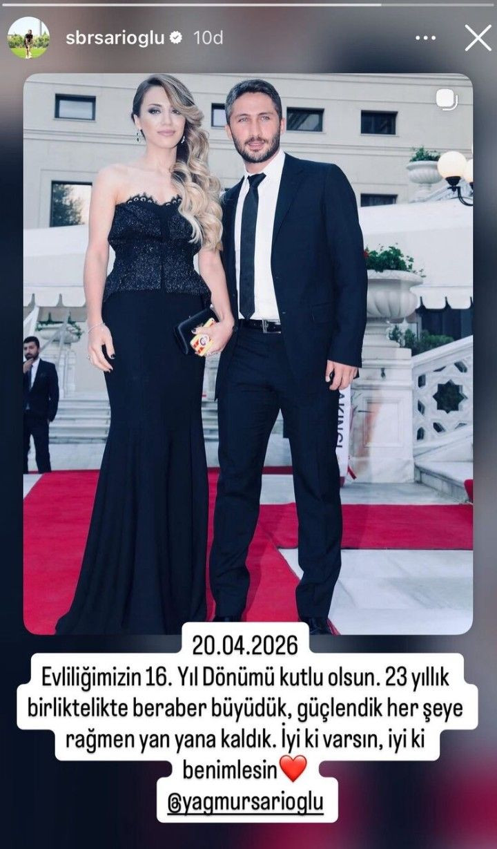Sarıoğlu, sosyal medya paylaşımında, "20.04.2026. Evliliğimizin 16'ncı yıl dönümü kutlu olsun. 23 yıllık birliktelikte beraber büyüdük, güçlendik, her şeye rağmen yan yana kaldık. İyi ki varsın, iyi ki benimlesin" ifadelerini kullandı.