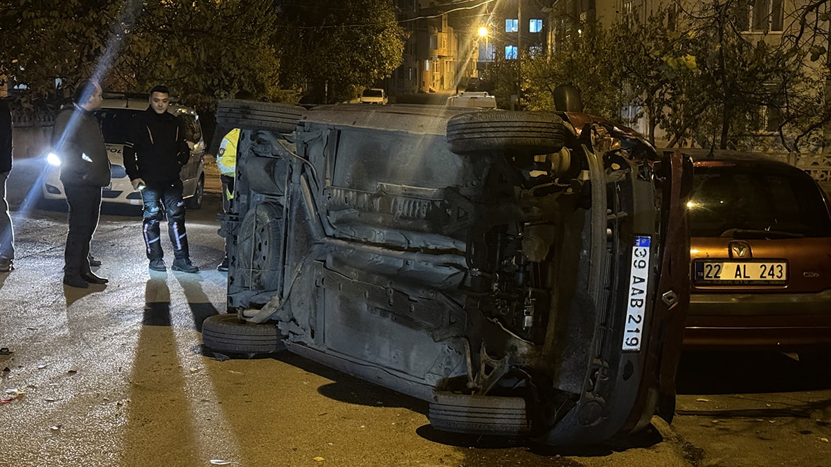 Kırklareli'nde sürücüsünün kimliği henüz belirlenemeyen 39 AAB 219 plakalı hafif ticari araç, Kocahıdır Mahallesi Murat Sokak'ta park halindeki iki otomobile çarparak devrildi.