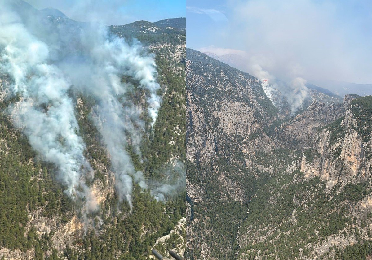 Burdur'un Altınyayla ilçesindeki Karanlıkdere Kanyonu'nda çıkan orman yangınına havadan ve karadan müdahale ediliyor.
