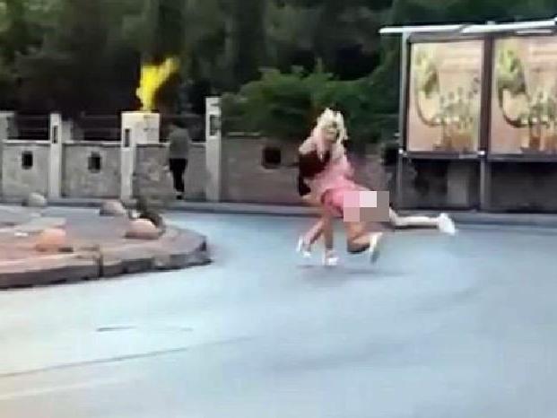Yola yatırdığı kadının kafasını defalarca tokatlayan kadın, ayağa kalkıp tekmelemeye devam etti. Kavga esnasında yoldan geçen bazı sürücülerin umursamadan yollarına devam ettiği görüldü.