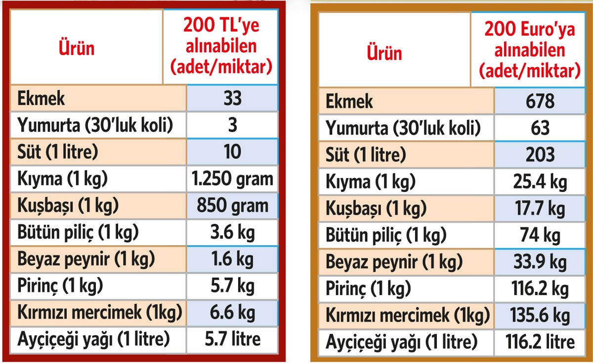 Dün itibarıyla 1 Euro, 20.35 TL seviyesine ulaştı. Türk Lirası değer kaybettiçe de yabancılar açısından ülkemiz adeta alışveriş cennetine dönüştü. Bir Avrupalı 200 Euro’yu bozdurduğunda kilogramı 230 TL olan kuşbaşıdan, 17.7 kilogram alabiliyor. Vatandaşlarımız ise zar zor kazandığı 200 TL ile ancak 850 gram et alabiliyor. Aynı şekilde bir Türk vatandaşı 200 TL ile tanesi 6 TL’den 33 adet ekmek zor alıyor. Bir diğer temel gıda ürünü olan yumurtada da durum daha vahim. 30’luk yumurtanın kolisi 65 TL’den satılıyor ve vatandaş 200 lira ile sadece 3 koli yumurta alabiliyor. Avrupalı Türkiye’de 63 koli yumurtayı sepetine koyabiliyor.