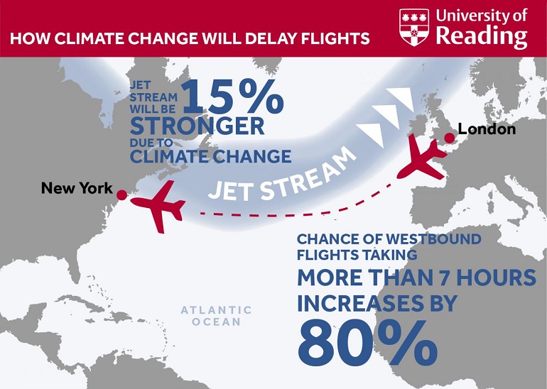 Araştırmacılar bir bilgisayar modellemesi kullanarak atmosferdeki karbondioksit miktarının iki katına çıkması halinde jet akıntılarının nasıl bir hal alacaklarını inceledi. Bu koşullar altında jet akıntısının daha da kuvvetlendiğini; buna bağlı olarak İngiltere’den Amerika’ya gerçekleştirilen uçuşların neredeyse iki katı daha uzun sürede tamamlanabileceğini gözlemlediler. Bugün normal bir Atlantik üzeri uçuş 6-8 saat arası sürmekte.