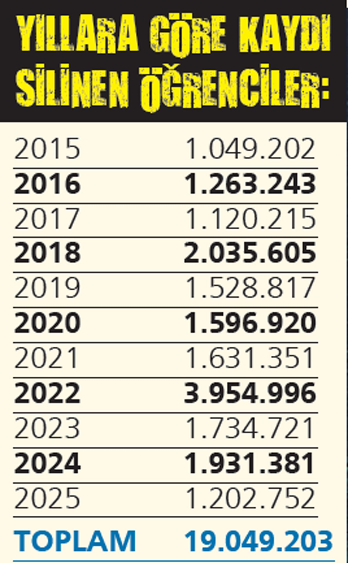 2015 yılından bu yana üniversite eğitiminden kopan 19 milyonu aşkın öğrencinin 16.9 milyonu devlet üniversitelerinden, 2.1 milyonu vakıf üniversitelerinden, 57 bini de vakıflara bağlı meslek yüksek okullarından ayrıldı.