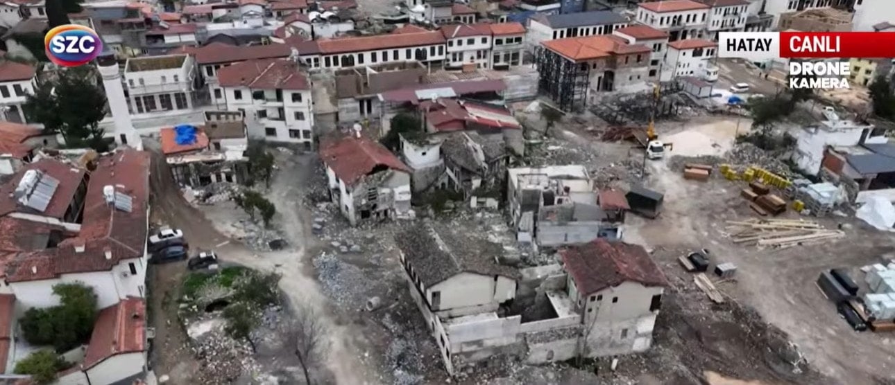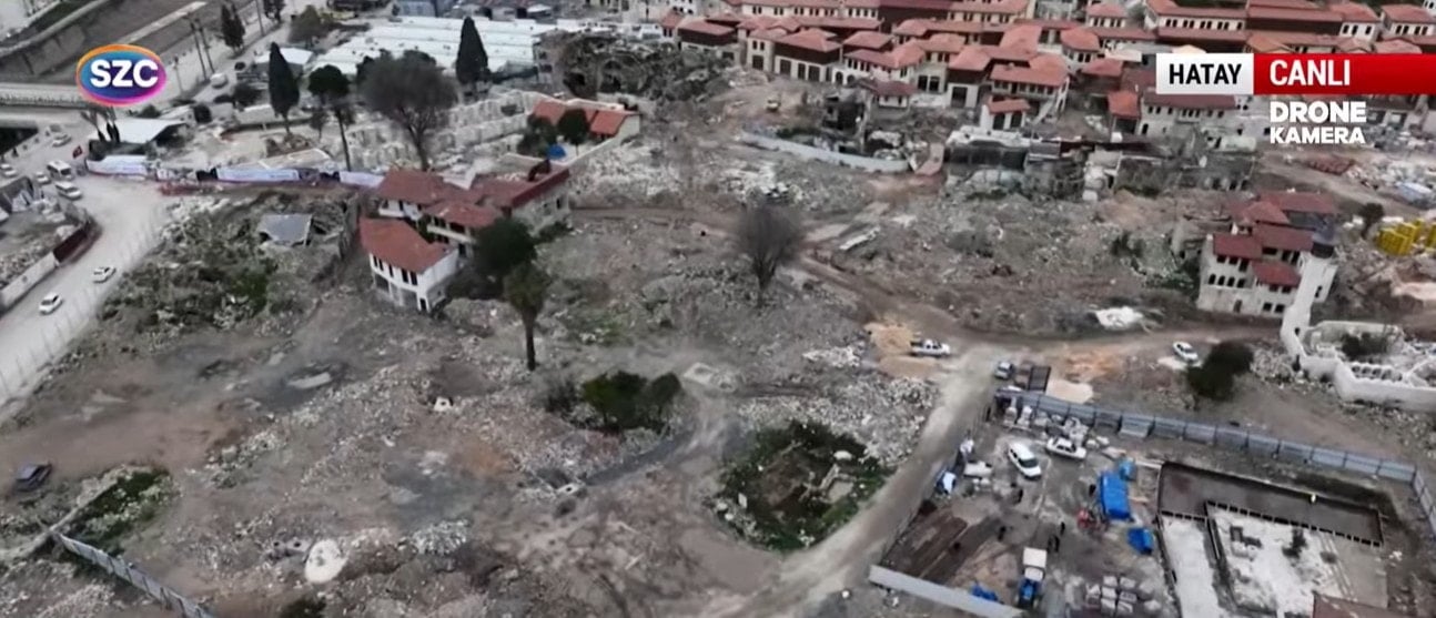 Özellikle Eski Antakya bölgesinde çekilen drone görüntülerinde enkaz ve moloz yığınlarının hâlâ kaldırılmadığı görüldü.