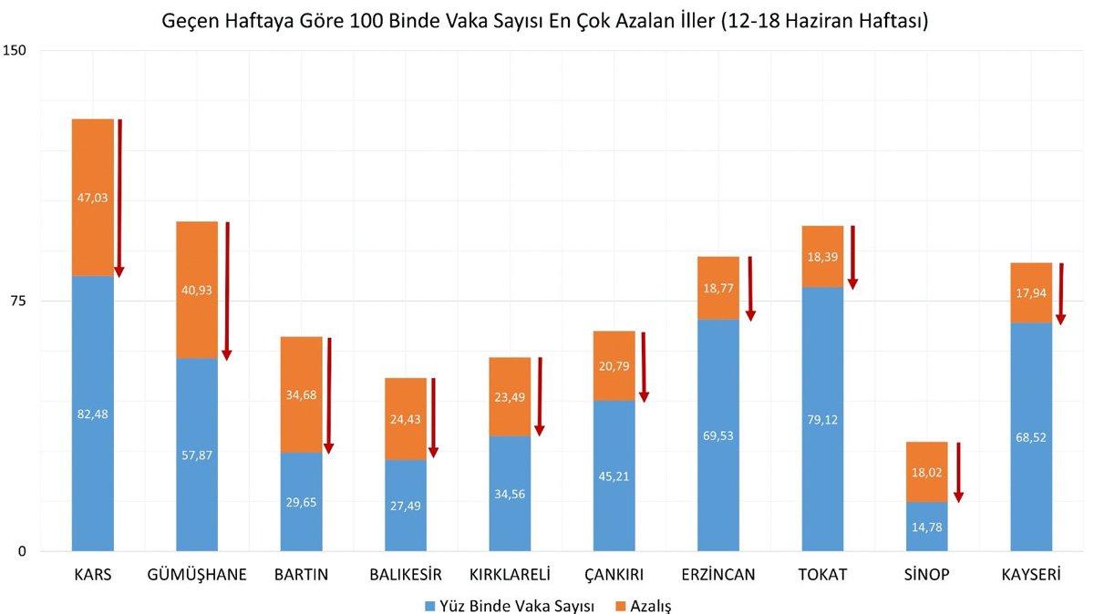 Bakan Koca, Twitter hesabından son bir haftada vaka sayısı en çok azalan illeri de duyurdu. Koca'nın açıklamasına göre, vaka sayısı en çok Kars, Gümüşhane, Bartın, Balıkesir, Kırklareli, Çankırı, Erzincan, Tokat, Sinop ve Kayseri'de azaldı.