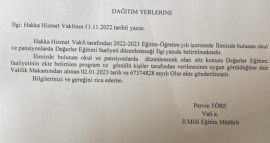 Eskişehir İl Milli Eğitim Müdürü Pervin Töre, kaymakamlıklara ve ilçe milli eğitim müdürlüklerine gönderdiği yazı ile Hakka Hizmet Vakfı tarafından Eskişehir'de bulunan okul ve pansiyonlarda 'Değerler Eğitimi' faaliyeti düzenleneceğini duyurdu.