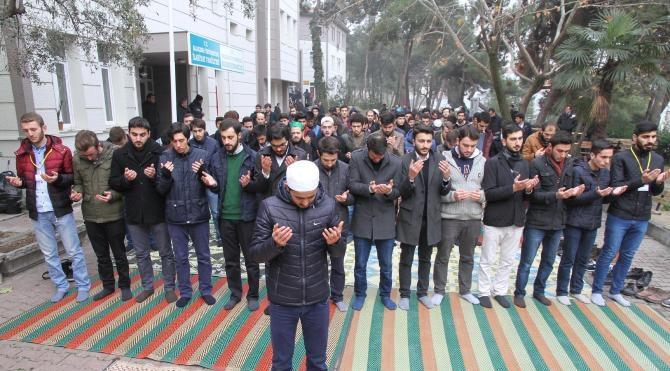 İlahiyat Fakültesi`nden yaklaşık 50 öğrenci, öğle namazını kıldıktan sonra `Kıyam-et` ve `Müslümanlar Birleşin` yazılı pankartlarla yürüyerek, tekbir getirdi. Necatibey Eğitim Fakültesi girişinde basın açıklaması yapan öğrenciler, `Onlar için yaşam cehennem, Davamız İslam bizim, Tüm ebucehiller bir olsa da, Ümmet coğrafyası hepimizin`, `Safları sık tutalım, 4 ayaklı ODTÜ`lüler girmesin`, `Müslüman olduğum için sana rahatsızlık verdiysem, verdiğim rahatsızlıktan dolayı gurur duyarım`, `Bin yıldır bu topraklarda kılınan namazları ne Haçlılar ne Moğollar engelleyebildi. Siz hayırdır?` yazılı dövizler taşıdı. Eyleme AK Parti Balıkesir İl Gençlik Kolları Başkanı Ömer Marmaralı ve AK Parti Fakülte Başkanı Fatih Ecrin de destek verdi. İlahiyat Fakültesi`ndeki kız öğrenciler de eylemi okul pencelerinden izleyip, fotoğraf çekti.