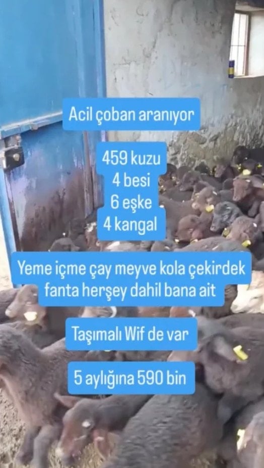 Paylaşılan ilanda işin şartları oldukça net şekilde sıralandı. Buna göre çobanın 459 kuzu, 4 besi hayvanı, 6 eşek ve 4 Kangal köpeği bulunan bir sürüyle ilgileneceği belirtildi. İlan sahibi ayrıca yeme, içme, çay, meyve, kola, çekirdek ve gazlı içeceklerin de dahil olduğunu ifade etti.