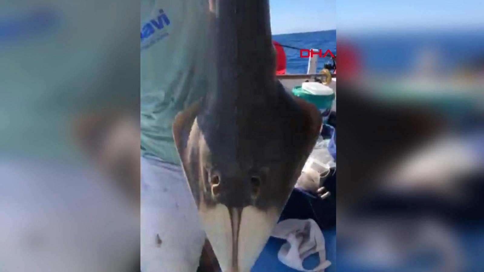 Oltasındaki büyük balığı görünce kısa süreli şaşkınlık yaşayan amatör balıkçı, 1,2 metre boyundaki sapan balığının nesli tehlike altındaki türler arasında yer aldığını tekne kaptanından öğrendi.