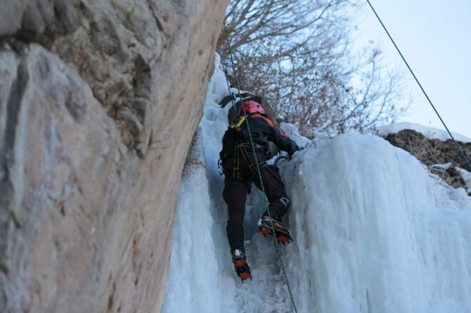Şelaleye ekip olarak giden dağcılar buzda tırmanış gerçekleştiriyor. (İHA)
