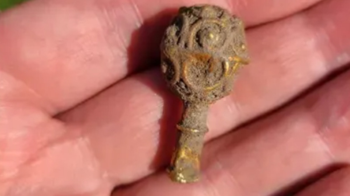 Altın nesne yalnızca 4 cm uzunluğunda ve küçük bir topuz şeklinde. 2021 yılında aynı bölgede bir metal dedektörüyle bulunan benzer bir parçaya oldukça benziyor, ancak biraz daha büyük. O nesne, MS 800–1000 yılları arasına tarihlenen bir “topuz başlı iğne” olarak tanımlanmıştı.