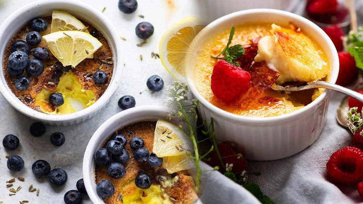Şeker Karamelizasyonu: Servis etmeden önce tatlıların üzerine ince bir kat kahverengi şeker serpin ve bir mutfak üfleme cihazıyla karamelize edin. Alternatif olarak, fırının ızgara modunda da şeker eriyene kadar ısıtabilirsiniz.