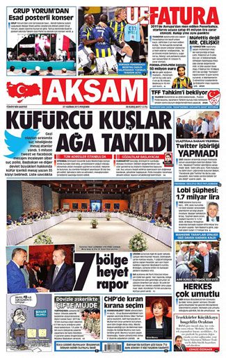 Akşam'ın Gezi parkı olayları üzerinden tweet baskınlarına değindiği haberinde "Gezi olayları sırasında suç niteliğinde mesaj atanlar yandı. 5 milyon Tweet ve Facebook mesajını inceleyen siber suç polisi, Başbakan ve diğer devlet büyükleri hakkında küfür içerikli mesaj yazan 35 kişiyi belirledi. Liste savcılıkta" denildi.