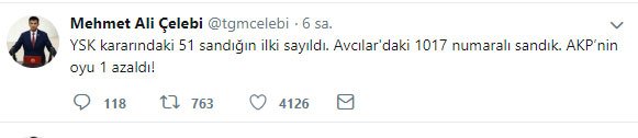 CHP'li Özgür Karabat da yine Avcılar'da "2372 nolu sandıkta ise AKP'ye fazladan yazılan iki (2) oy silindi." diyerek son durumu bildirdi.