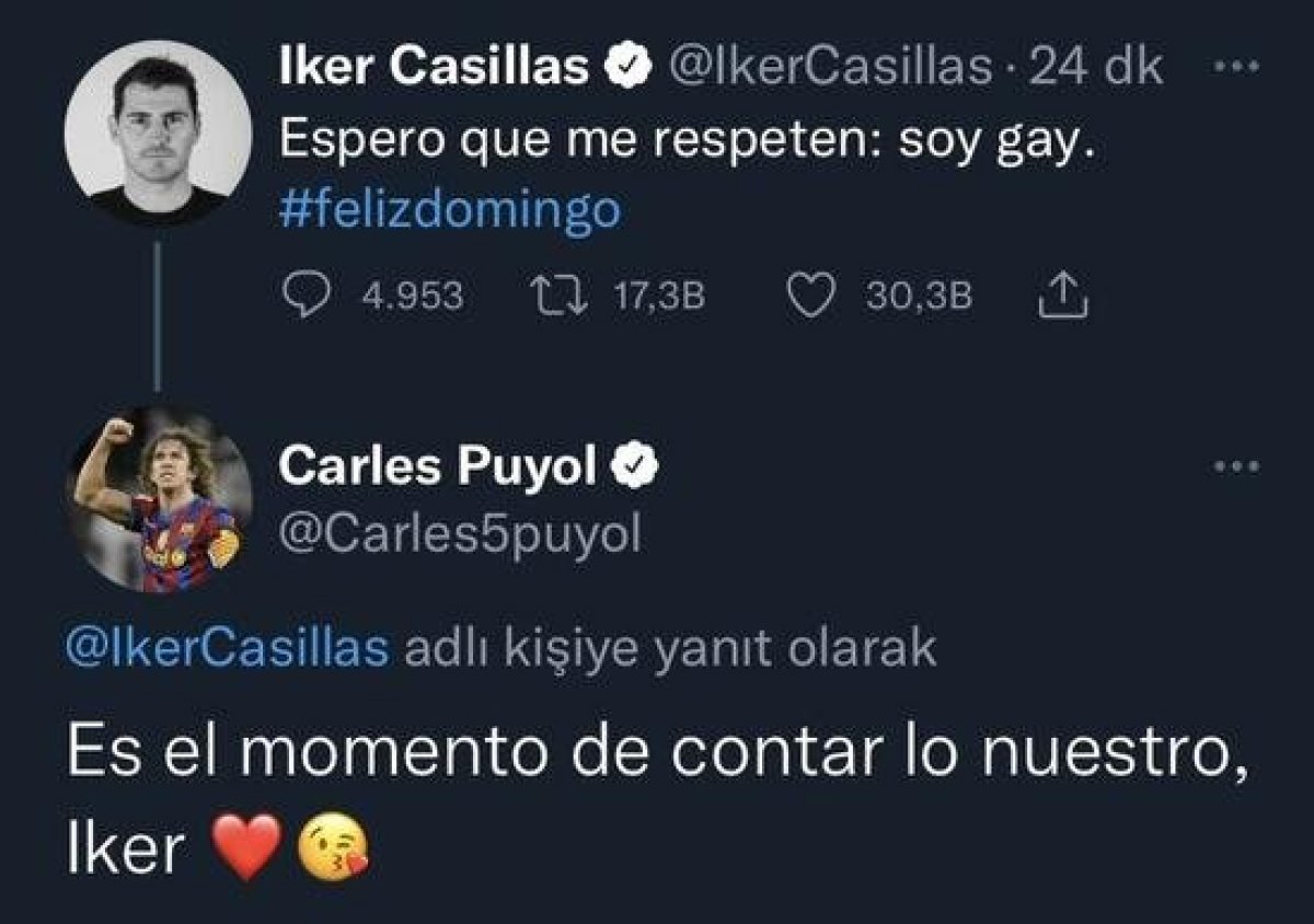 İlk olarak Real Madrid'in efsane ismi Iker Casillas paylaşımda bulundu. Eski kaleci, paylaşımında "Umarım bana saygı duyarsınız. Ben bir eşcinselim" yazdı. Iker Casillas'ın paylaşımına Barcelona'nın eski savunma oyuncusu Carles Puyol'dan yanıt geldi.