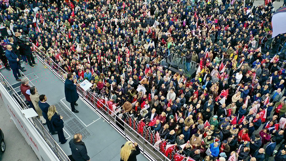 CHP Ümraniye Belediye Başkan adayı Aykut Erdoğdu ile bir araya gelip, seçim otobüsüne binen İmamoğlu, ilçe turu yapmak istedi. İmamoğlu ve Erdoğdu’yu taşıyan otobüsün önü, Aşık Veysel caddesinde, kalabalık ve coşkulu bir vatandaş topluluğu tarafından kesildi. İlçe turu olarak planlanan Ümraniye etkinliği, böylece halk buluşmasına dönüştü. Vatandaşların sevgi gösterilerini karşılıksız bırakmayan İmamoğlu ve Erdoğdu, coşkulu kalabalığa birer konuşma yaptı. Vatandaşların ilgisinden duyduğu memnuniyeti, “Hakkınızı helal edin. Vallahi ne diyeyim? O kadar minnet doluyum ki, teşekkürleri bir borç biliyorum. Çünkü biz, bu akşam, Aykut Başkanımla birlikte, İlçe Başkanımızın çizdiği bir güzergahta, sizleri otobüsle selamlayacaktık. Ama siz, muazzam bir karşılamayla tabiri caizse, bizi motive etmek için toplanmışsınız” sözleriyle dile getirdi.