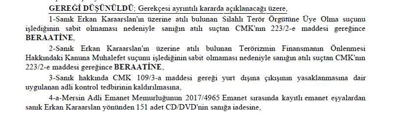 1-Sanık Erkan Karaarslan’ın üzerine atılı bulunan ‘Silahlı Terör Örgütüne Üye Olma’ suçunu işlediğinin sabit olmaması nedeniyle sanığın atılı suçtan CMK’mn 223/2-e maddesi gereğince BERAATİNE.