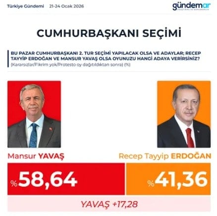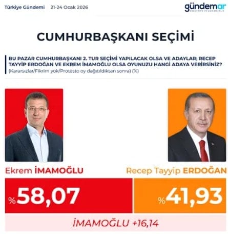 Gündemar araştırma tarafından yapılan son anketin sonuçları açıklandı. 21-24 Ocak 2026 tarihleri arasında yapılan Cumhurbaşkanlığına ilişkin olası ikinci tur senaryolarında İmamoğlu, Erdoğan karşısında 16,14 puanlık bir farkla önde yer aldı.