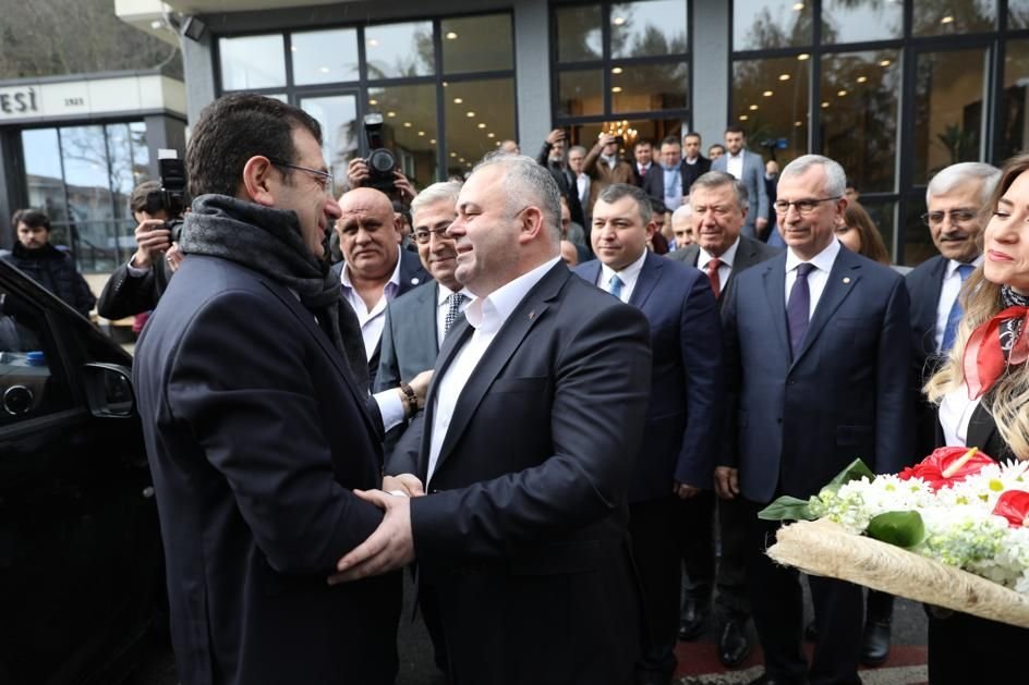 İmamoğlu ve ekibi, Çatalca Belediyesi önünde Belediye Başkanı Mesut Üner ile ilçede faaliyet gösteren parti üyeleri ve vatandaşlar tarafından karşılandı.