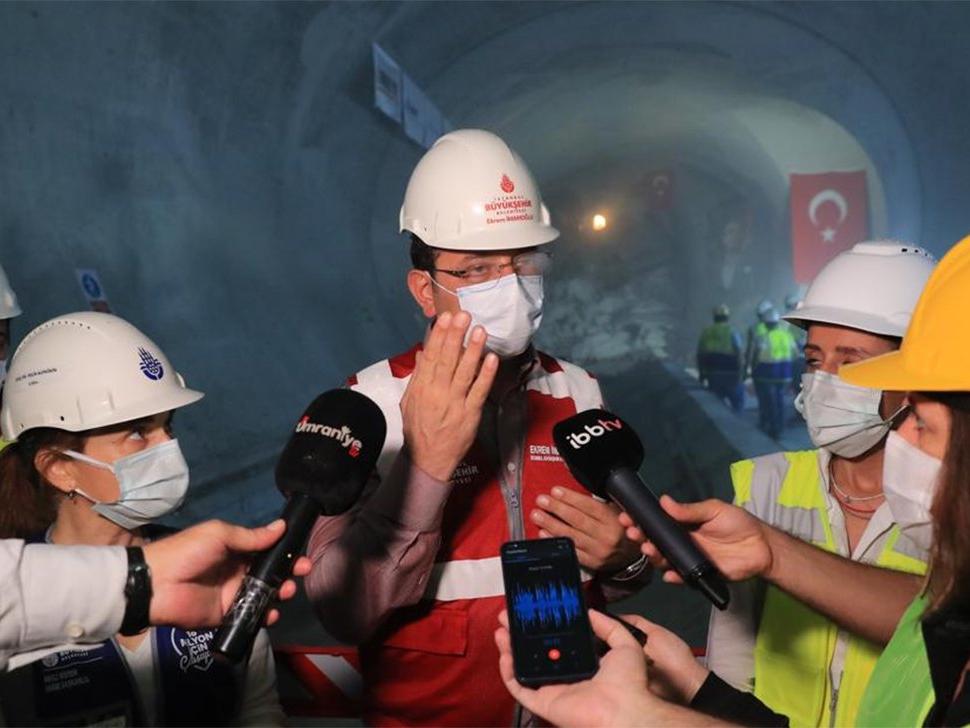 TBM cihazının (Tunel Boring Machine-Tünel Açma Makinesi), son beton bloku delme işlemini, çalışanlarla birlikte izleyen İmamoğlu, Raylı Sistemler Daire Başkanı Pelin Alpkökin'den çalışmalarla ilgili bilgi aldı. İmamoğlu ve çalışanlar, delme işleminin tamamlanmasını alkışlarla kutladı.