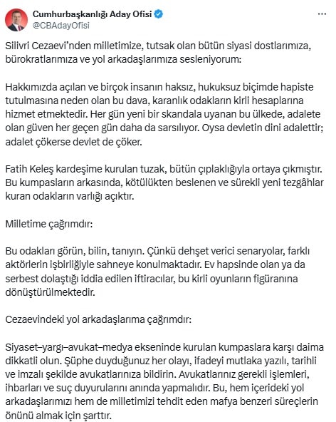 "Silivri Cezaevi’nden milletimize, tutsak olan bütün siyasi dostlarımıza, bürokratlarımıza ve yol arkadaşlarımıza sesleniyorum: