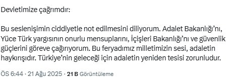 Bu seslenişimin ciddiyetle not edilmesini diliyorum. Adalet Bakanlığı’nı, Yüce Türk yargısının onurlu mensuplarını, İçişleri Bakanlığı’nı ve güvenlik güçlerini göreve çağırıyorum. Bu feryadımız milletimizin sesi, adaletin haykırışıdır. Türkiye’nin geleceği için adaletin yeniden tesisi zorunludur."