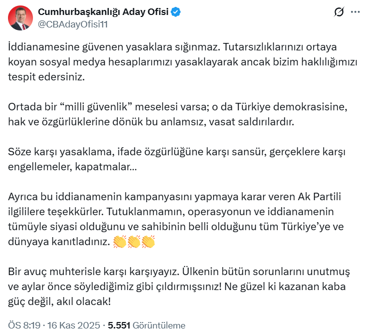 "İddianamesine güvenen yasaklara sığınmaz. Tutarsızlıklarınızı ortaya koyan sosyal medya hesaplarımızı yasaklayarak ancak bizim haklılığımızı tespit edersiniz.
