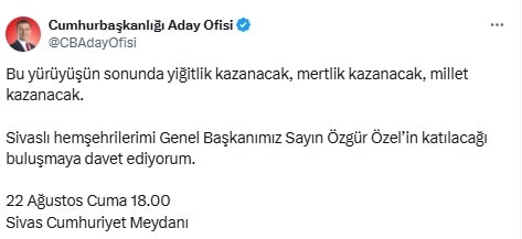 Özel, mitinge ilişkin sosyal medya hesabından, "AK Parti’nin kara düzeni, çocuklara, kadınlara, bebeklere, askerlere, doğaya, hayvanlara, bu ülkeye iyi gelmiyor. Ama biz bu düzeni değiştireceğiz; herkes için adil, eşit ve özgür bir düzeni getireceğiz! Yarın akşam Sivas’ta buluşuyoruz!" paylaşımını yaptı.