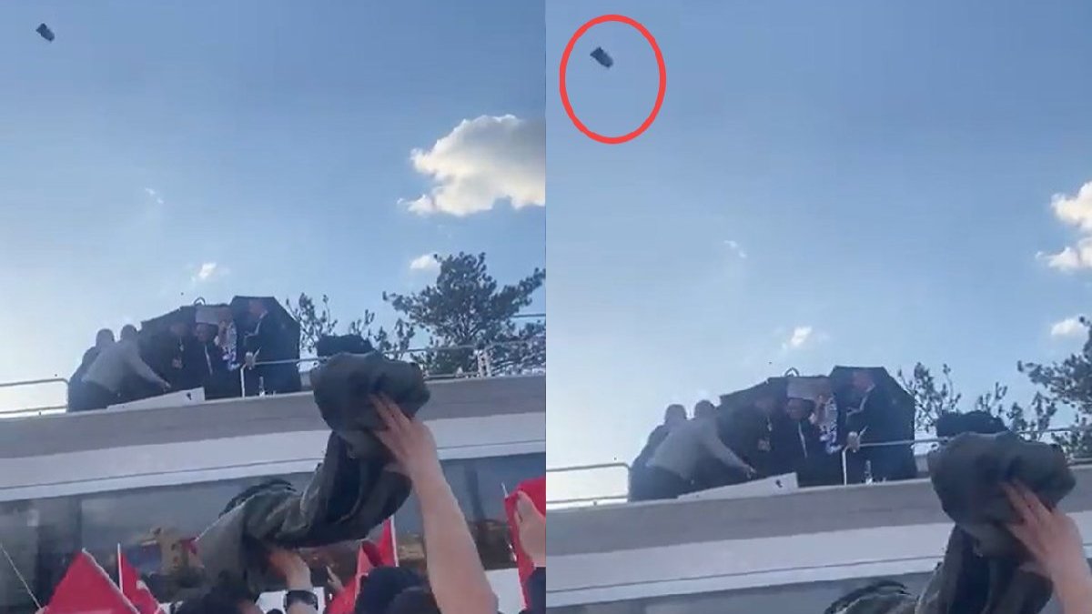 İmamoğlu'nun Erzurum mitingine saldırı anları kameraya saniye saniye yansıdı. Görüntülerde İmamoğlu konuşma yaptığı sırada taşların atıldığı, İmamoğlu’nu atılan taşlardan yanındakilerin siper yaparak korumaya çalıştığı görülüyor.