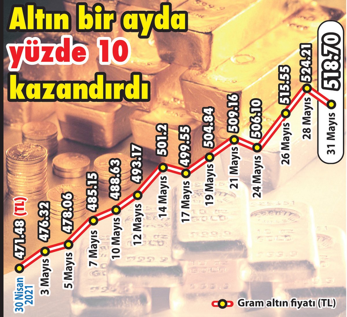 İstanbul Mücevherciler Kuyumcular ve Sarraflar Derneği Başkan Yardımcısı Mehmet Ali Yıldırımtürk, altına olan yönelimin süreceğini, kripto paralardan güvenli limanlara bir kayış gözlendiğini belirtti. Yurtiçinde fiziki altına olan talebinin düştüğünü aktaran Yıldırımtürk, “Geçen yılki gibi krediler aracılığı ile altına yönelecek bir nakit artışı olmadığı gibi dövizde de bir çözülme olmuyor. Düğünlerin yapılamıyor olması da bunda etkili. Dolayısıyla haziranda altın fiyatlarında ons ve döviz kurları kaynaklı bir artış beklense de; bu artışta talep etkisi olmayacak” dedi.