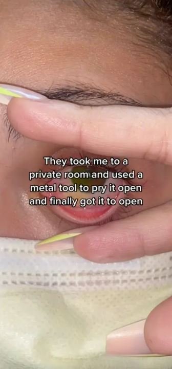 Gözünün üzerine sürdüğü ovma kremi görselinin kenarına, "Bana yapıştırıcıyı parçalayan ve çözen bir merhem sürdüler," diye yazdı. Ardından, "İşe yaramadı, bu yüzden gözümü ayırmaya çalışırken yapıştırıcıyı koparmaya başladılar," diye ekledi.