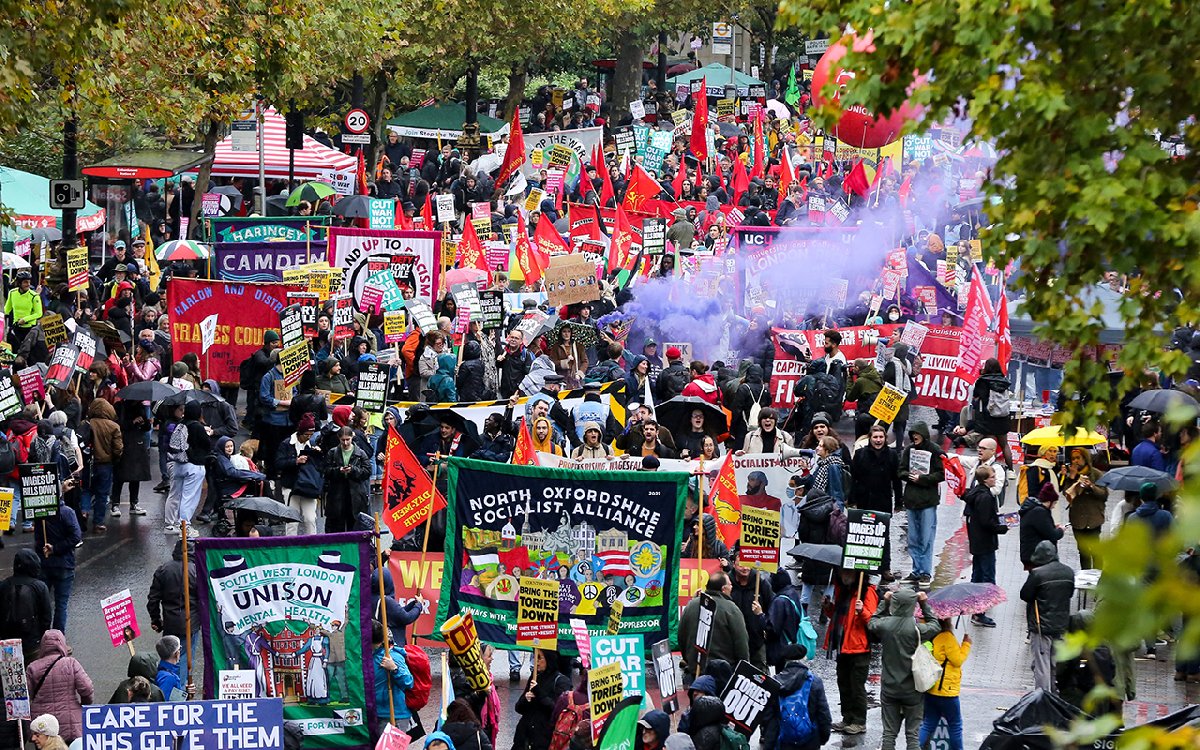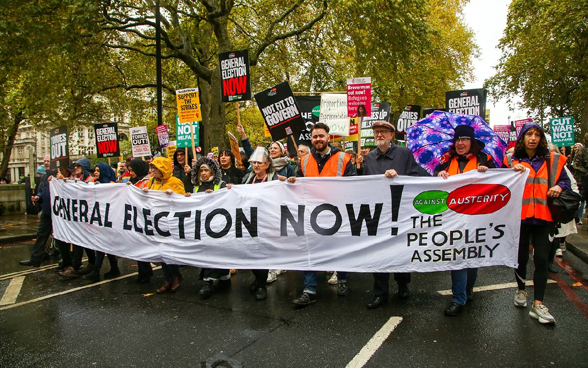 Ellerinde, "Enerji faturalarını azaltın, maaşları artırın", "Muhafazakar Parti istifa", "Şimdi genel seçim zamanı", "Mülteciler hoş geldiniz" yazılı pankartlar taşıyan göstericiler, kemer sıkma politikaları nedeniyle İngiltere Başbakanı Rishi Sunak'a tepki gösterdi ve istifa çağrısında bulundu.