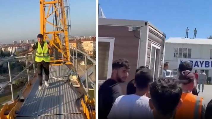 "Ücret haktır gasp edilemez" diye slogan atan işçiler, işveren temsilcilerinin 19 Ağustos Pazartesi günü için sorunun çözüleceğine ilişkin söz vermeleri üzerine eylemi askıya aldı. Ancak kendilerine verilen sözün tutulmadığını, hatta yemek bile vermeyip yatakhanelerin boşaltılmasının istendiğini belirten inşaat işçileri bu sabah vinç kulesinin üzerinde hak mücadelesi yaptı.
