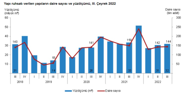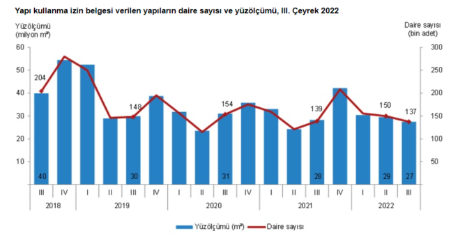 2022'nin üçüncü çeyreğinde bir önceki yılın aynı dönemine göre yapı kullanma izin belgesi verilen yapıların bina sayısı ise yüzde 3,7 artarken, daire sayısı yüzde 0,8 ve yüzölçümü yüzde 2,8 azaldı.