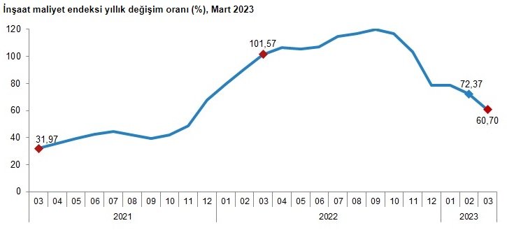 Bina inşaatı maliyet endeksi, bir önceki aya göre yüzde 2,04, bir önceki yılın aynı ayına göre yüzde 62,94 arttı. Bir önceki aya göre malzeme endeksi yüzde 2,19, işçilik endeksi yüzde 1,68 arttı. Ayrıca bir önceki yılın aynı ayına göre malzeme endeksi yüzde 50,49, işçilik endeksi yüzde 105,16 arttı.